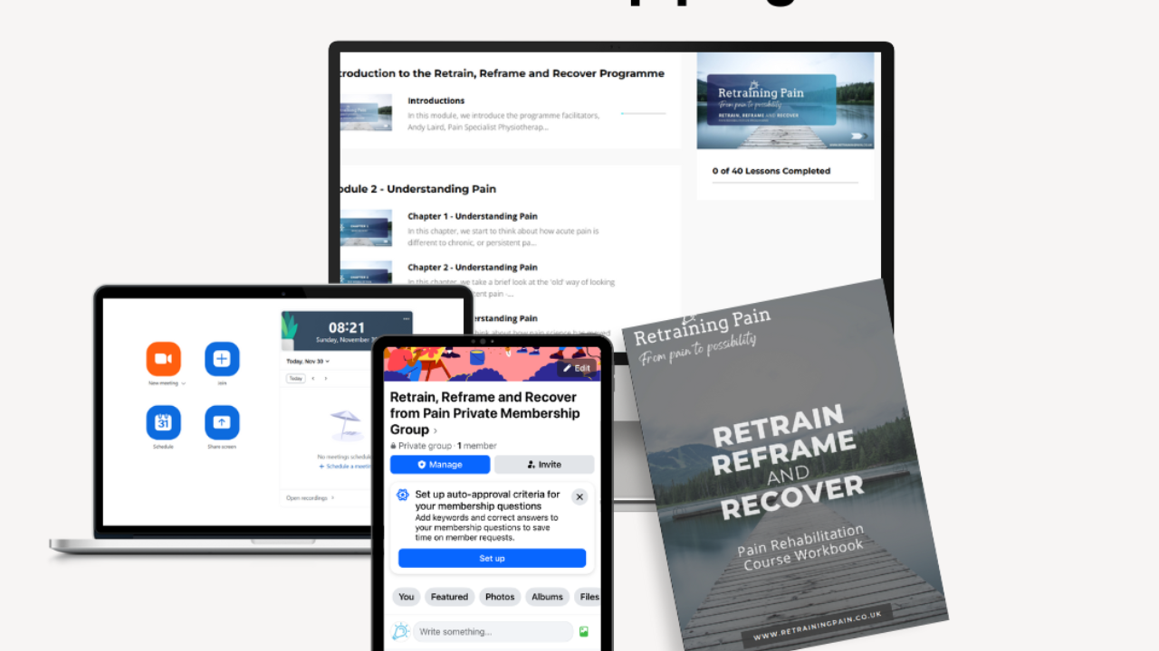 This self-directed, on-demand course empowers you to retrain your pain using the biopsychosocial model and proven techniques. Led by a clinical psychologist who specializes in pain management and a pain specialist physiotherapist, this course offers a unique, expert-driven approach. Designed for flexibility, it allows you to learn at your own pace, with a series of video lessons broken down into chapters and modules. You can watch at your convenience, revisit content as needed, and progress through the material in a way that suits your schedule.